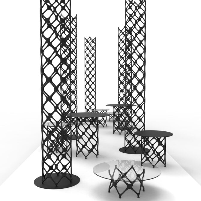 The modular system is inspired by structural features found in nature, deconstructed into components with various angles and functions. The stable and durable structure looks organic and complex, yet it is full of nature’s logic and order.